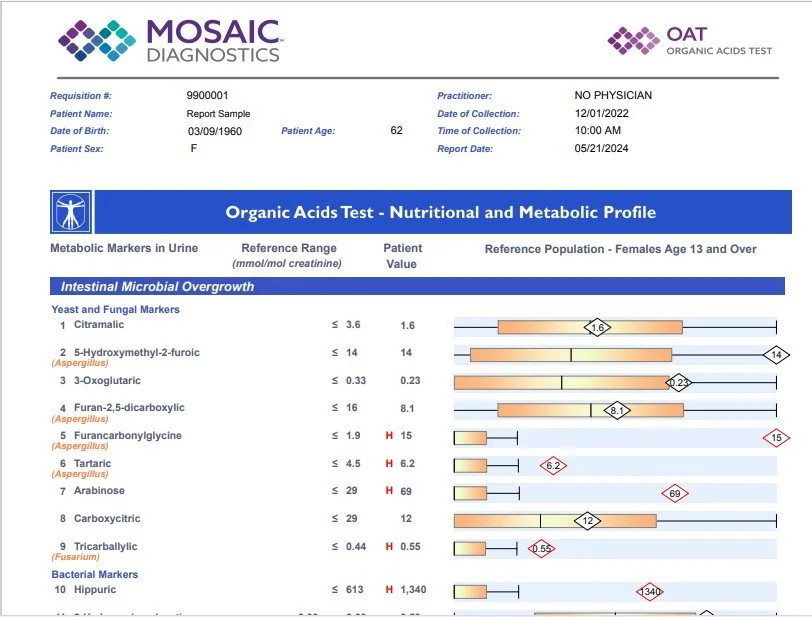 Urine test to assess 72 different markers related to protein, fat, and carb metabolism, yeast and fungus, bacterial metabolites, and more.