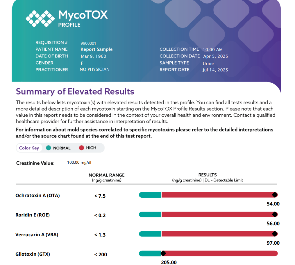 This test evaluates levels of mycotoxin excretion in urine. This is an important test if mold exposure is suspected. Mold can come from environmental exposures like water-damaged buildings or dietary exposures like commonly contaminated grains, dried fruits, etc. when improperly stored prior to packaging.